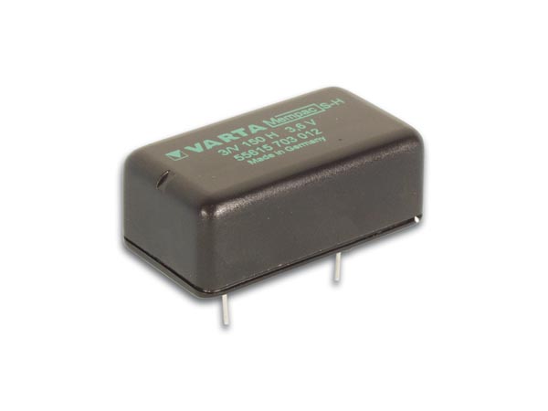 Spécifications : VARTA: 55615 604 059 type: Ni-MH tension: 4.8V capacité typ.: 140mAh dimensions: 27 x 14 x 25mm connexions: 3 broches vert. pour CI distance entre les pôles: - emballage: 1 pile en blister